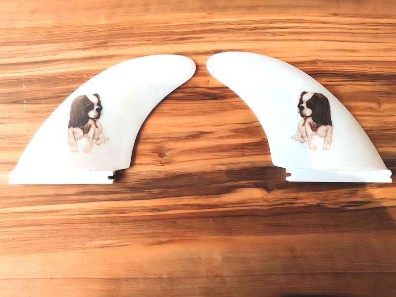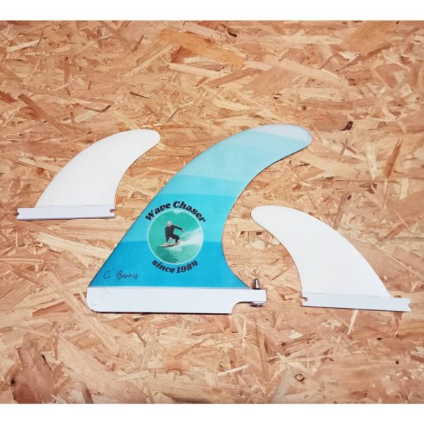 Nous vous proposons la personnalisation complète de vos ailerons. Pour cela, vous nous fournissez un fichier graphique format Pdf que nous imprimons sur un papier de soie fin. Ce papier est ensuite inséré sous la résine de glaçage, protégeant ainsi votre création graphique de l’eau de mer et des rayons du soleil pour longtemps !
